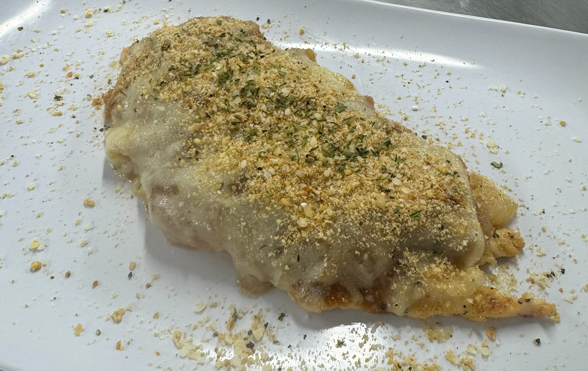 Sauteed chicken breast with caramelized onions and Swiss cheese topped with seasoned breadcrumbs